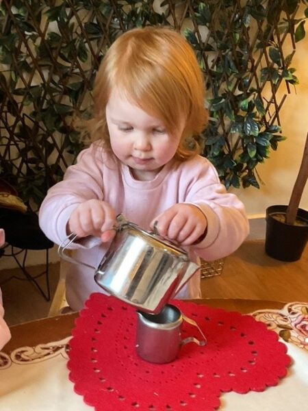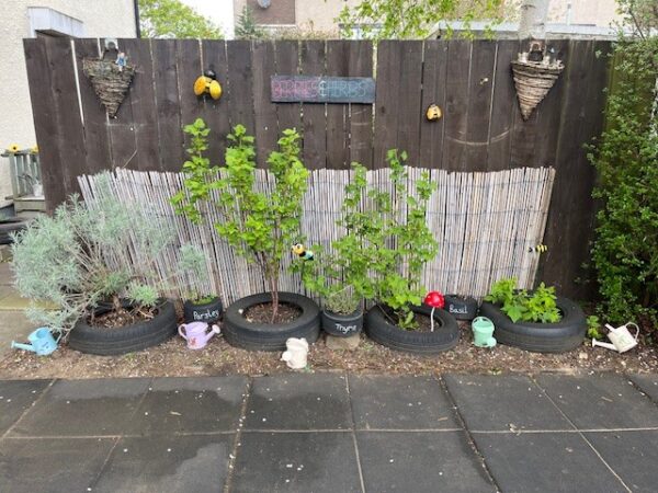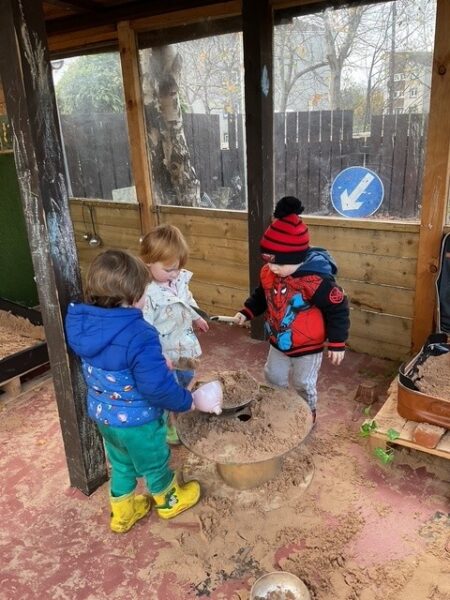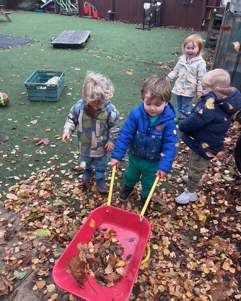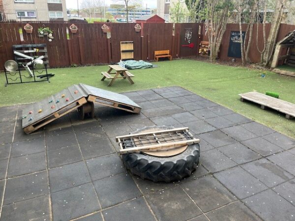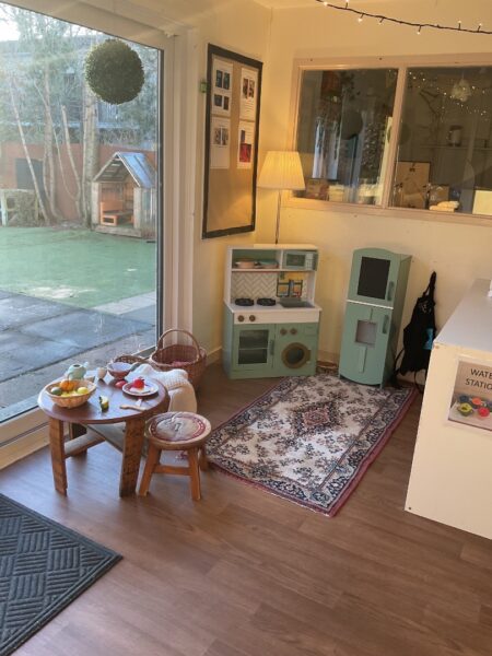 The playroom has direct access to a private fully enclosed garden which gives children the choice on whether to play indoors or outdoors in all weathers every day. Play areas within the garden are carefully set up with a mud kitchen, soil play, water play with many larger loose parts such as ladders, pallets, tyres, crates and wheels allowing children to be pilots in their own play.