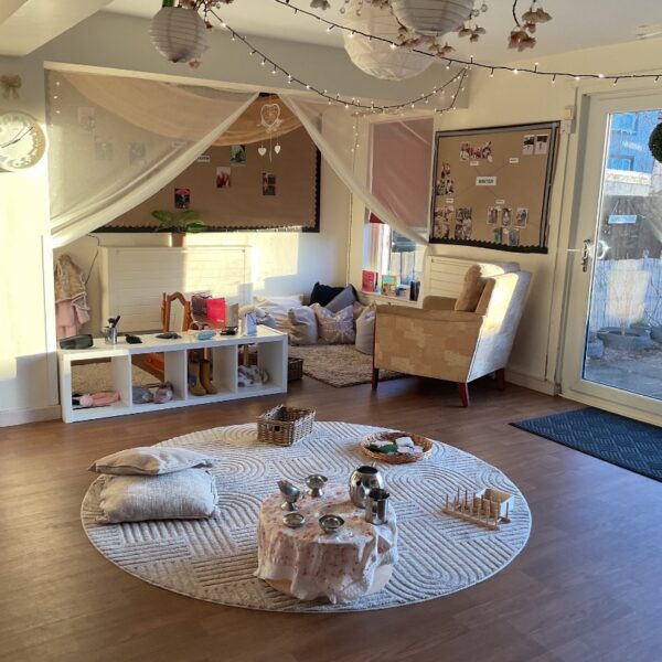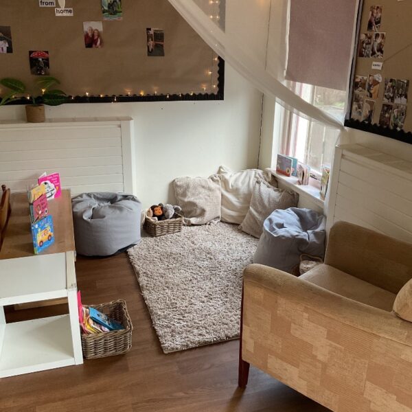 Our cosy corner is a calm nurturing space designed with soft lighting, comfortable cushions and accessible books. It encourages early language shared reading and quiet moments together. This inviting area supports emotional security and helps foster a lifelong love of stories.